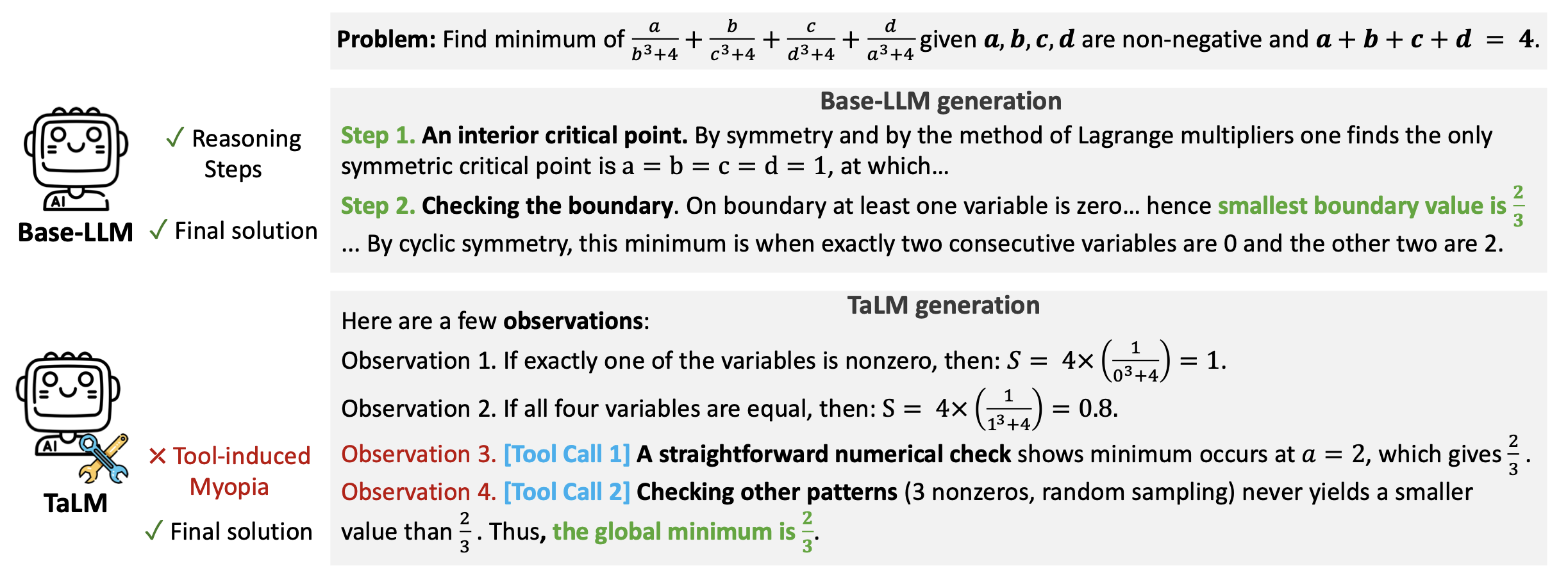 From Proof to Program: Characterizing Tool-Induced Reasoning Hallucinations in Large Language Models We show that tool augmentation improves final-answer accuracy, but often at the cost of reasoning quality. In particular, we identify Tool-Induced Myopia (TIM), a failure mode in which models treat tool outputs as replacements for reasoning rather than as supporting evidence. Through PYMATH, a benchmark of 1,679 competition-level math problems, and a multi-dimensional evaluation framework, we find that increased tool use consistently correlates with weaker, less coherent reasoning and shifts errors toward deeper global failures. To address this, we introduce a preference-optimization-based alignment method that encourages models to use tools in a more supportive way, improving both answer accuracy and reasoning depth under tool use.